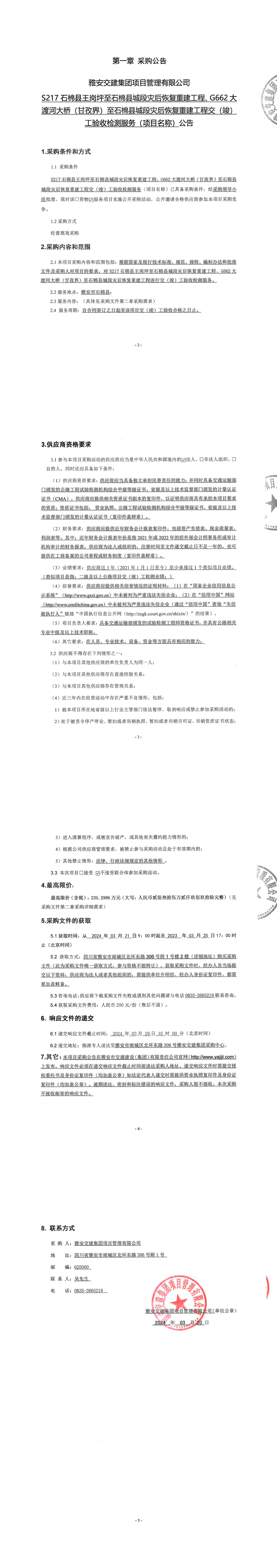 雅安交建集團(tuán)項(xiàng)目管理有限公司S217石棉縣王崗坪至石棉縣城段災(zāi)后恢復(fù)重建工程、G662大渡河大橋(甘孜界)至石棉縣城段災(zāi)后恢復(fù)重建工程交(竣)工驗(yàn)收檢測(cè)服務(wù)(項(xiàng)目名稱)公告