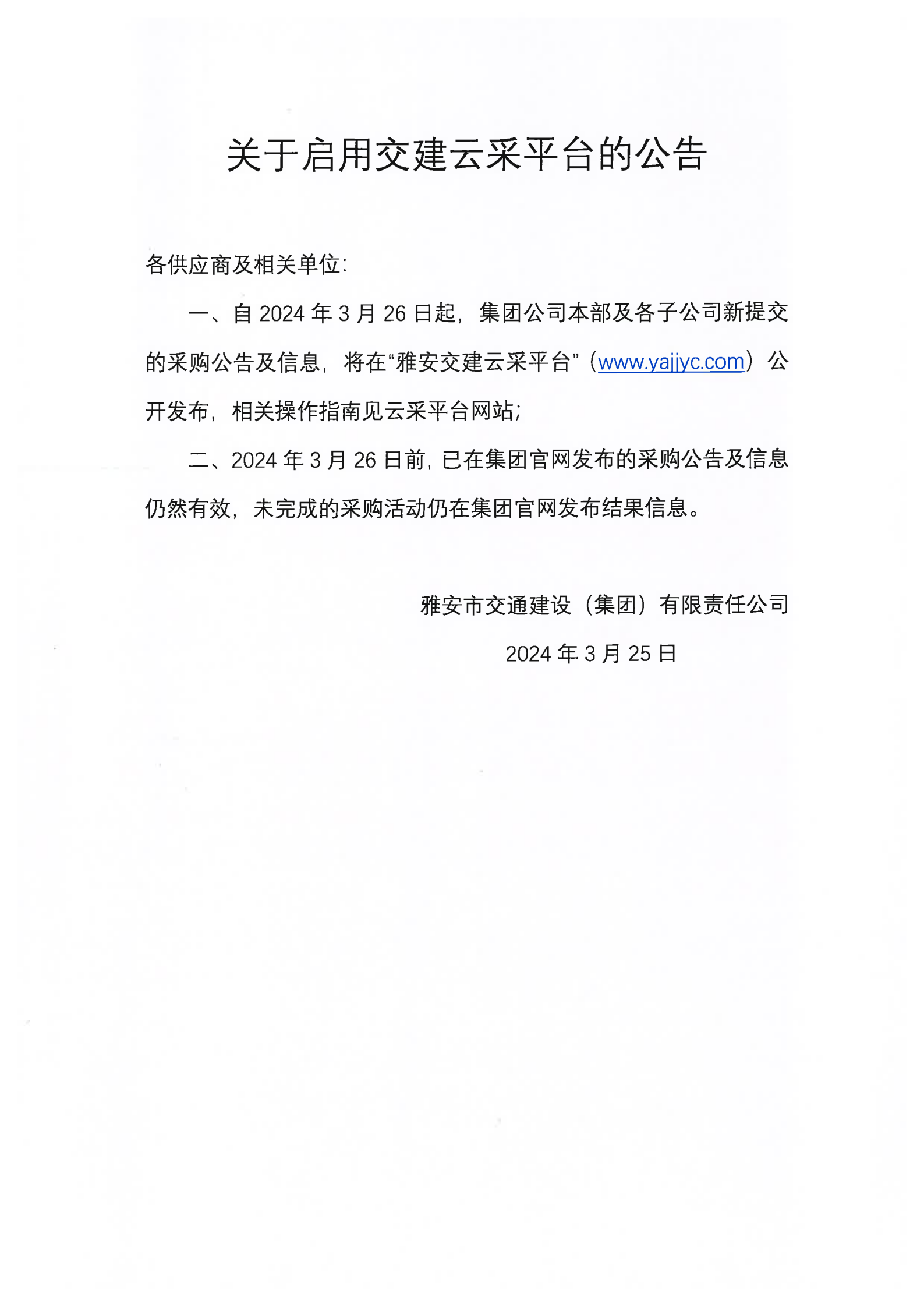 雅安市交通建設(shè)(集團)有限責(zé)任公司關(guān)于啟用交建云采平臺的公告