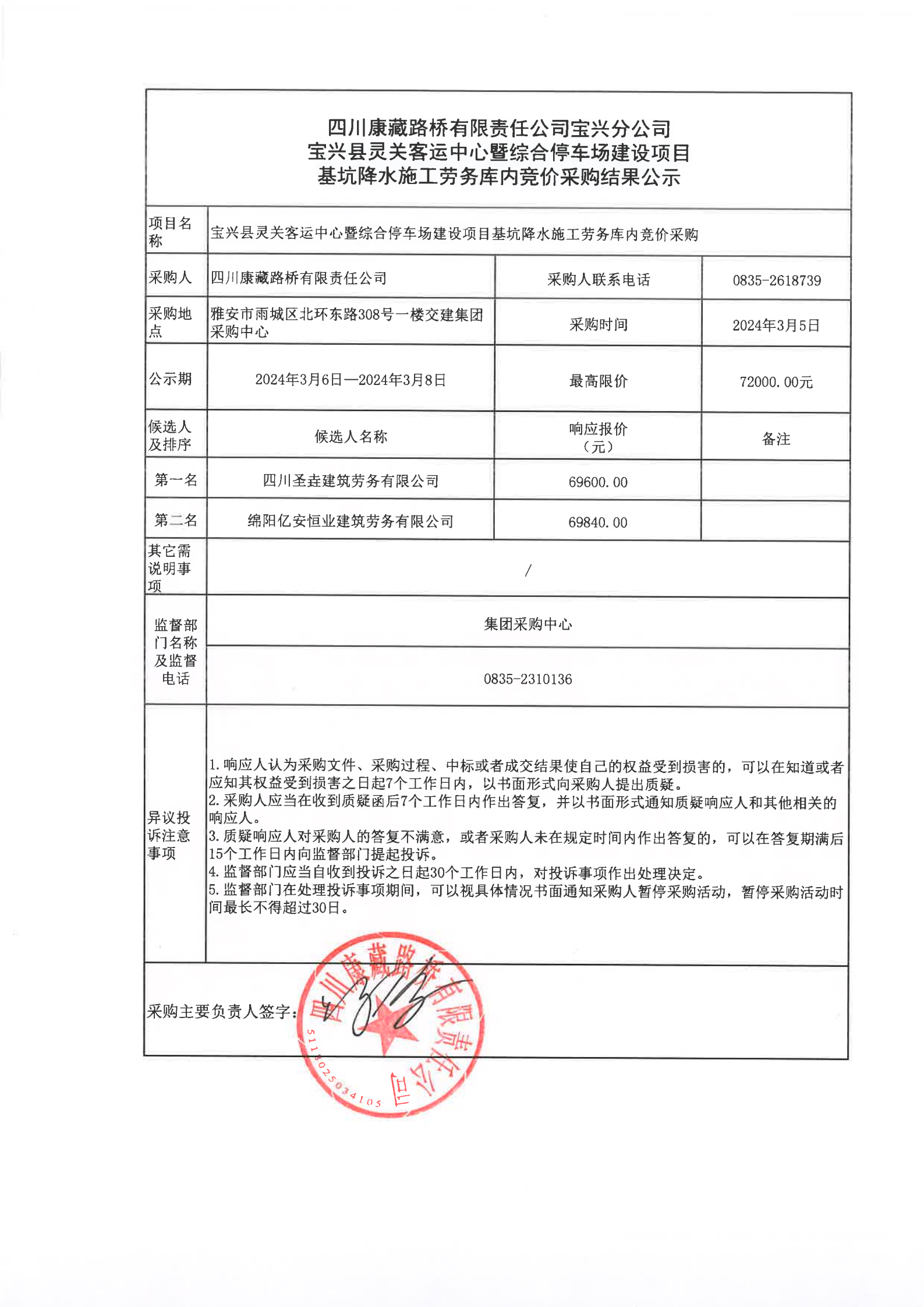 四川康藏路橋有限責任公司寶興分公司寶興縣靈關客運站中心暨綜合停車場建設項目基坑降水施工勞務庫內競價采購結果公示