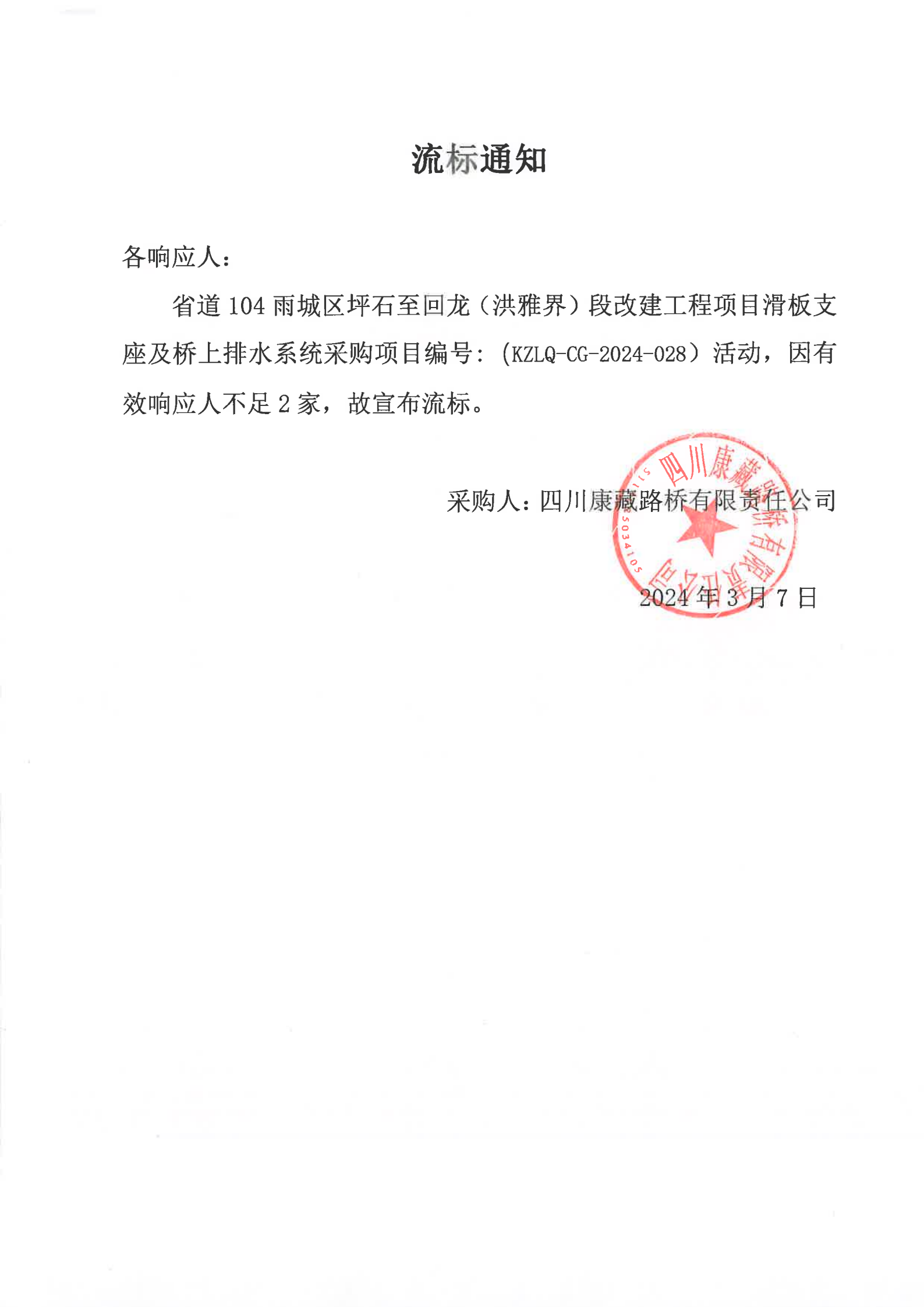 四川康藏路橋有限責(zé)任公司省道104雨城區(qū)坪石至回龍(洪雅界)段改建工程項目滑板支座及橋上排水系統(tǒng)流采購標(biāo)通知