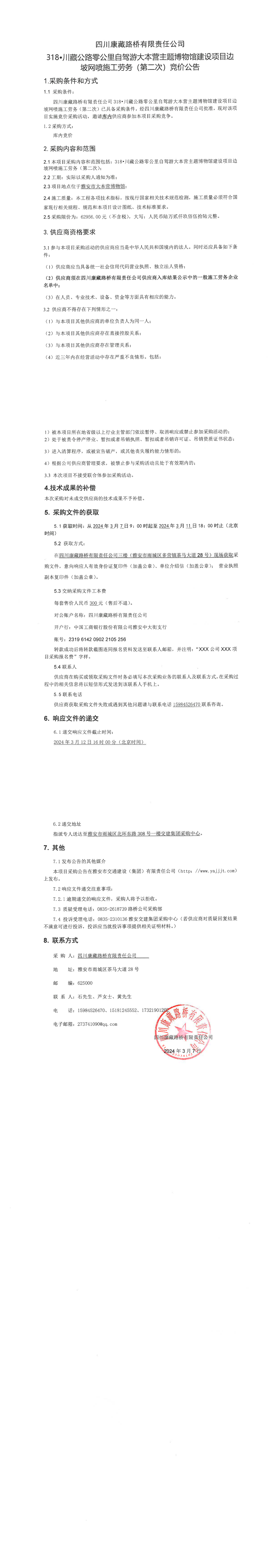 四川康藏路橋有限責任公司318·川藏公路零公里自駕游大本營主題博物館建設(shè)項目邊坡網(wǎng)噴施工勞務(wù)(第二次)競價公告