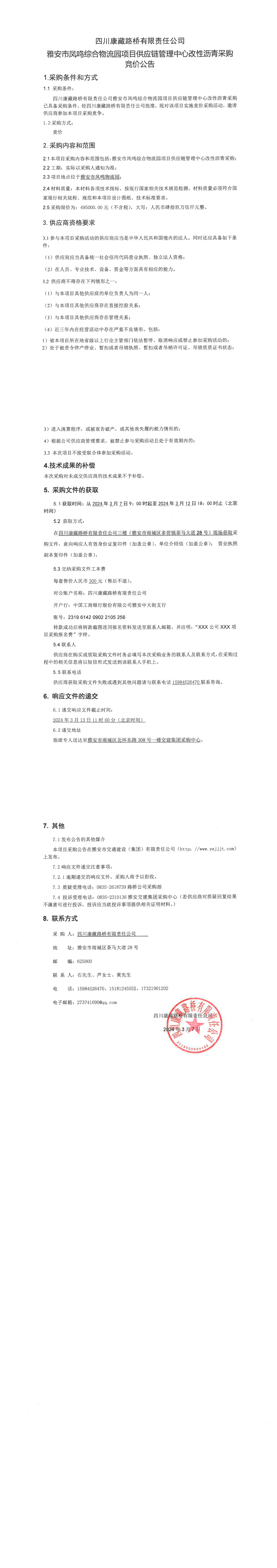 四川康藏路橋有限責(zé)任公司雅安市鳳鳴綜合物流園項(xiàng)目供應(yīng)鏈管理中心改性瀝青采購競價(jià)公告