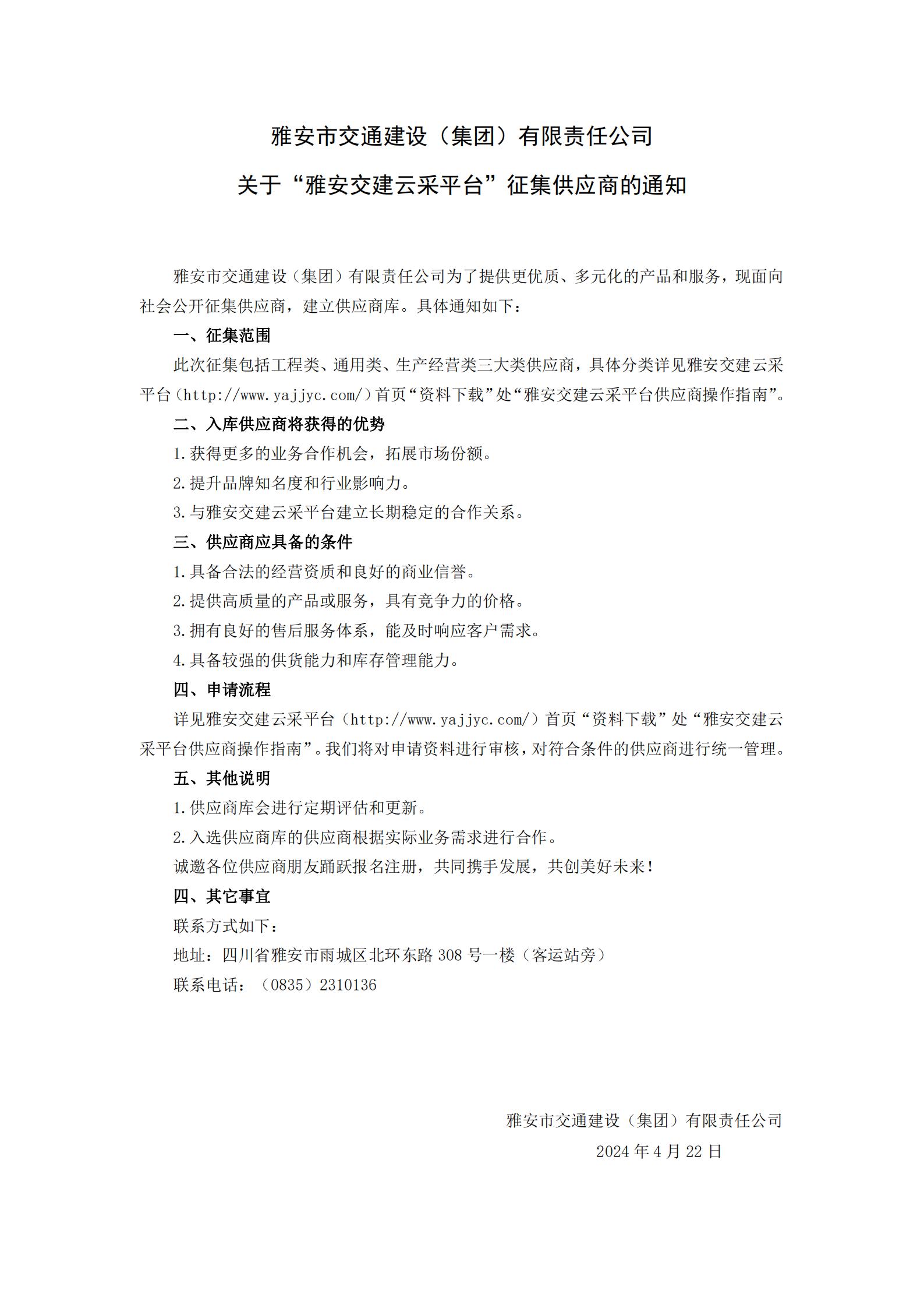 雅安市交通建設(集團)有限責任公司關于“雅安交建云采平臺”征集供應商的通知