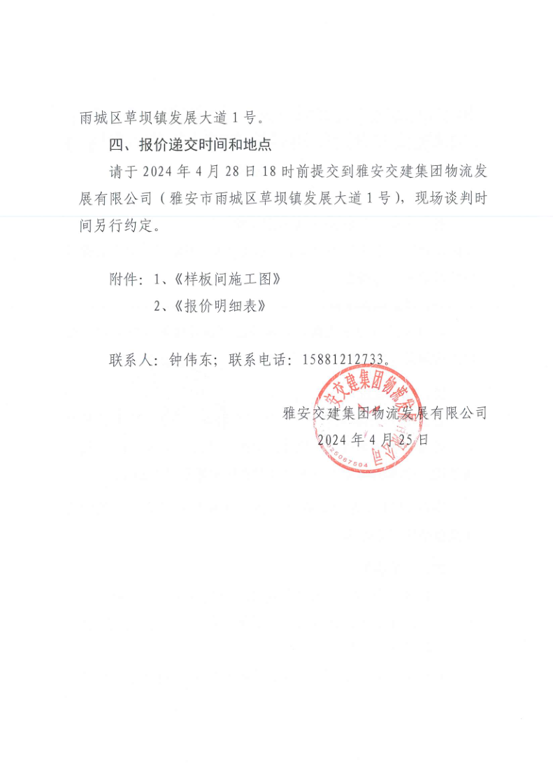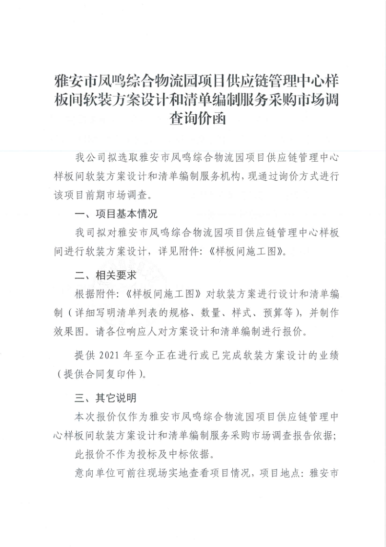 雅安交建集團物流發(fā)展有限公司雅安市鳳鳴綜合物流園項目供應鏈管理中心樣板間軟裝方案設計和清單編制服務采購市場調查詢價函