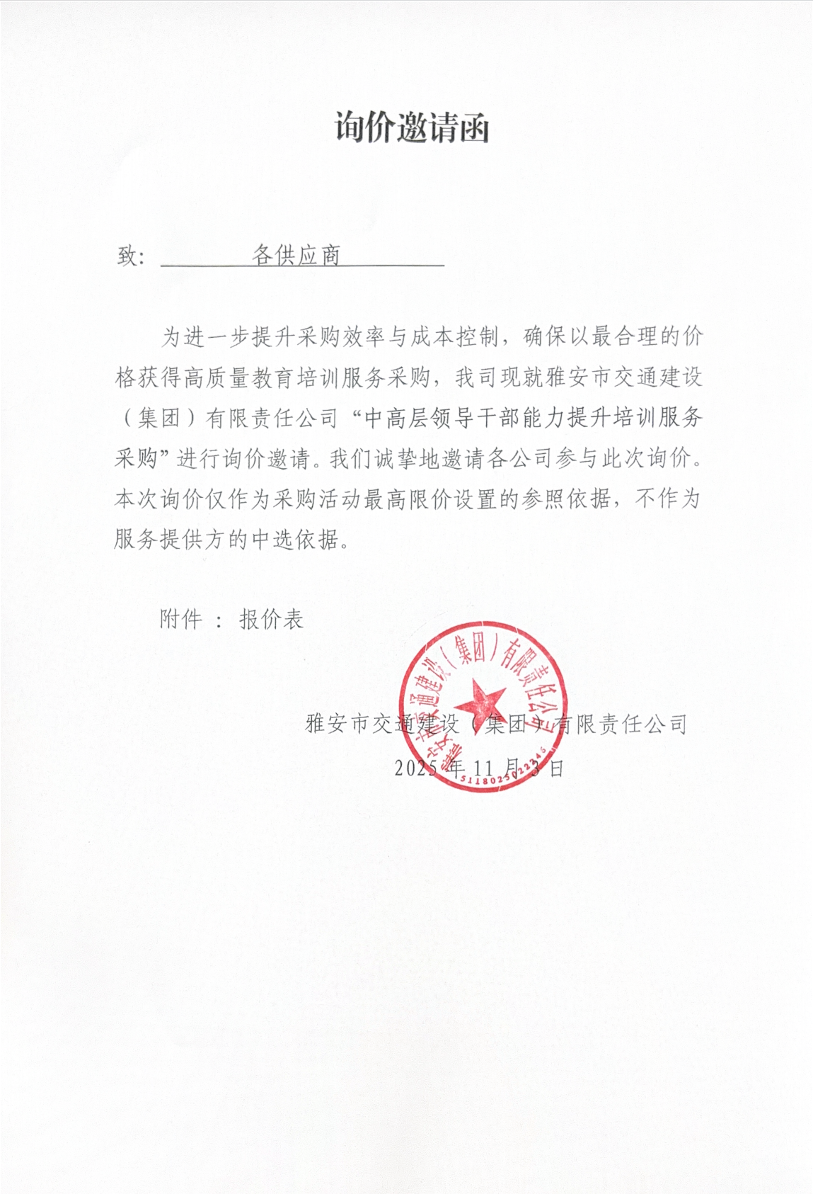 關于雅安交建集團下屬子公司主要負責人經(jīng)濟責任審計項目限價的詢價函
