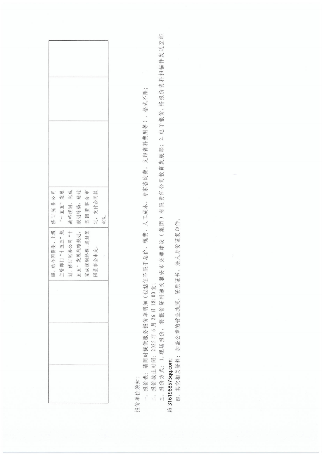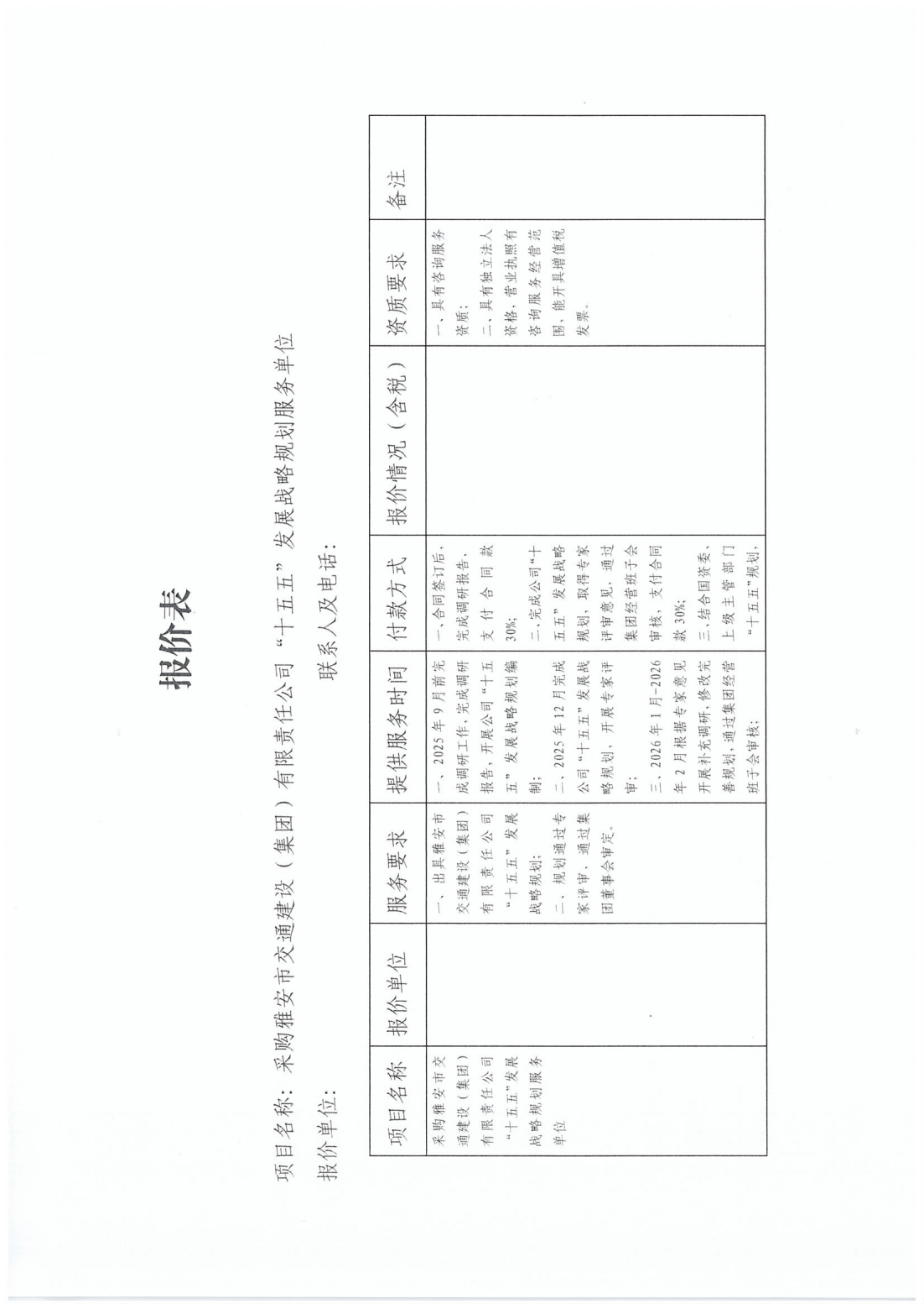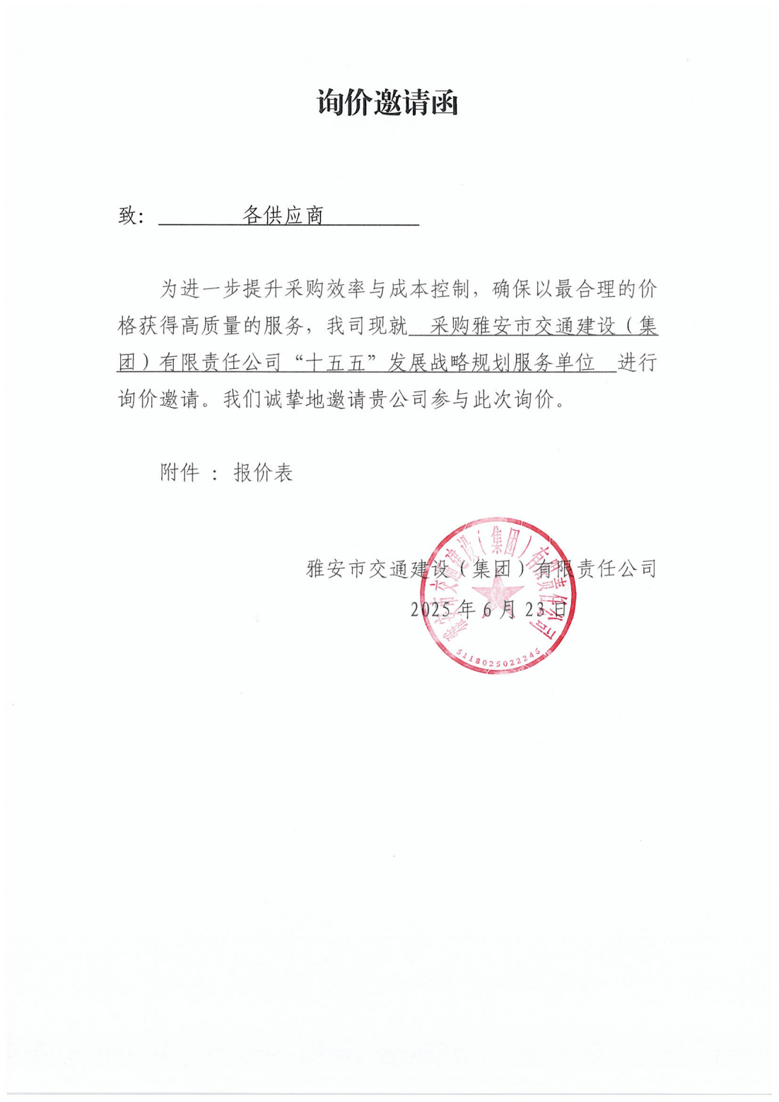關于采購雅安市交通建設(集團)有限責任公司“十五五”發(fā)展戰(zhàn)略規(guī)劃服務單位的詢價