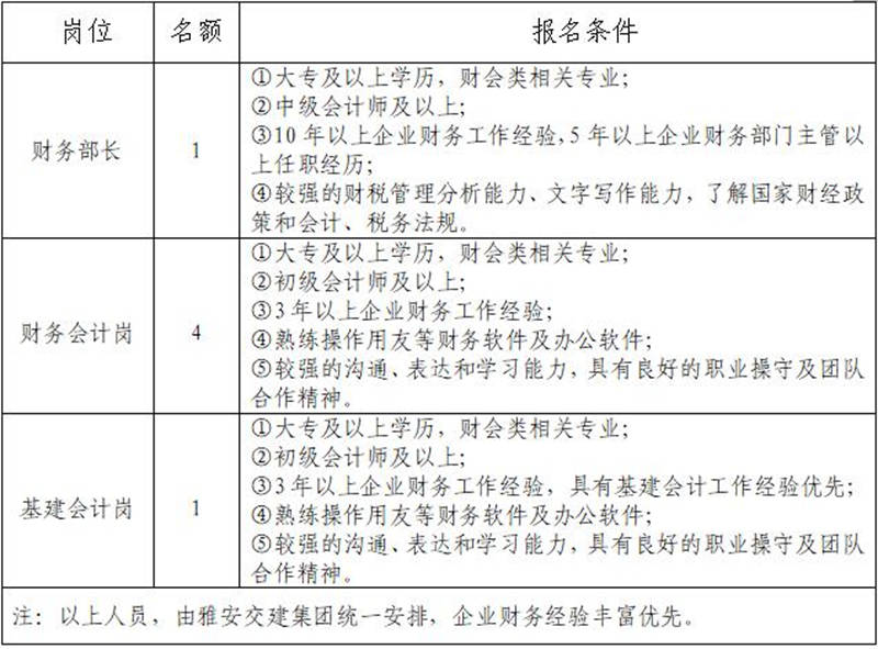 根據(jù)發(fā)展需要,決定面向社會公開招聘雅安市交通建設(shè)(集團)有限責(zé)任公司(以下簡稱“雅安交建集團”)所屬子公司財務(wù)部門負(fù)責(zé)人1名,工作人員5名,現(xiàn)將有關(guān)事項公告如下: