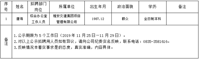 雅安交建集團項目管理有限公司擬聘用人員公示(項目管理公司)