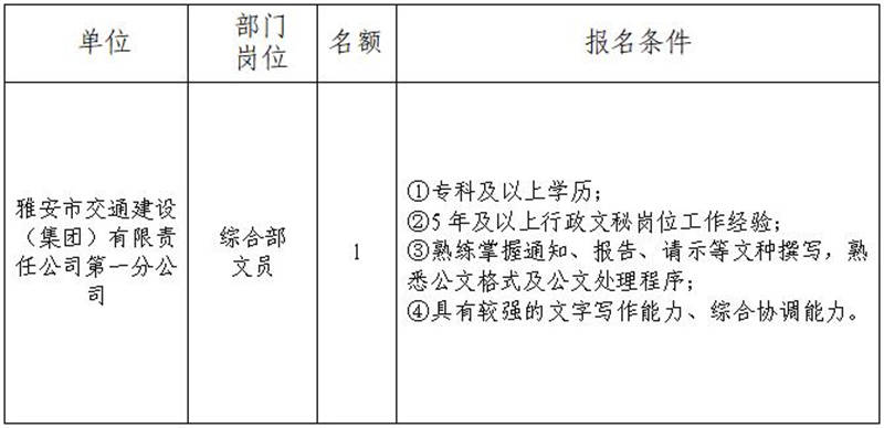 根據(jù)發(fā)展需要,決定面向社會(huì)公開招聘雅安市交通建設(shè)(集團(tuán))有限責(zé)任公司(以下簡稱“雅安交建集團(tuán)”)所屬分公司工作人員1名,現(xiàn)將有關(guān)事項(xiàng)公告如下: