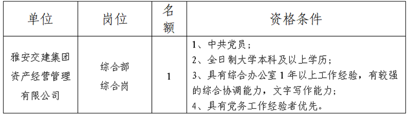 根據(jù)發(fā)展需要,決定面向社會(huì)公開招聘雅安市交通建設(shè)(集團(tuán))有限責(zé)任公司(以下簡(jiǎn)稱“雅安交建集團(tuán)”)所屬子一般工作人員1名,現(xiàn)將有關(guān)事項(xiàng)公告如下: