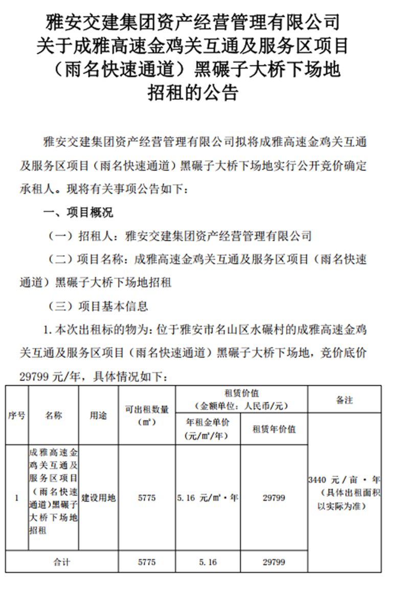 關(guān)于成雅高速金雞關(guān)互通及服務(wù)區(qū)項(xiàng)目(雨名快速通道)黑碾子大橋下場地招租的公告