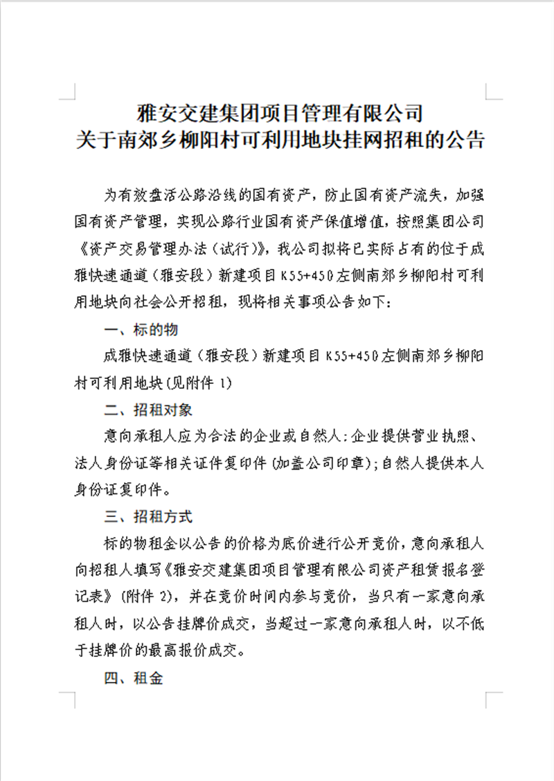 雅安交建集團(tuán)項(xiàng)目管理有限公司關(guān)于南郊鄉(xiāng)柳陽(yáng)村可利用地塊公開(kāi)招租的公告