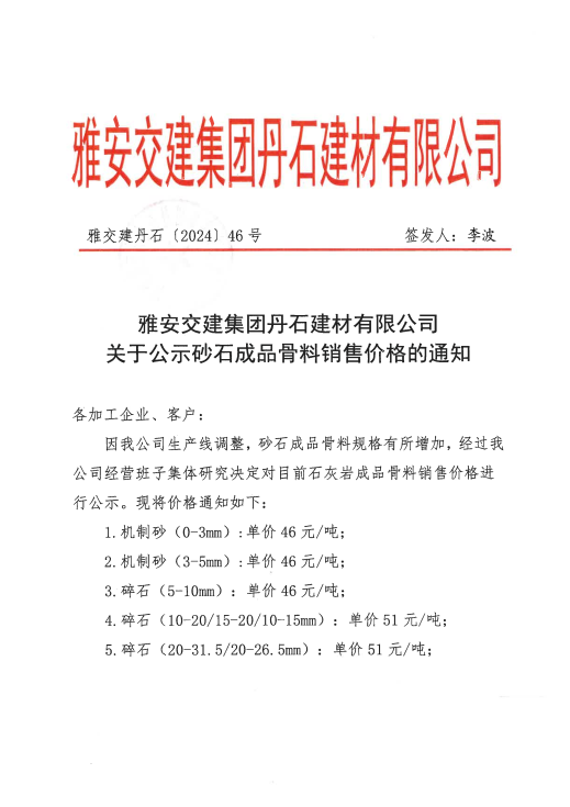 關(guān)于公示砂石成品骨料銷售價(jià)格的通知