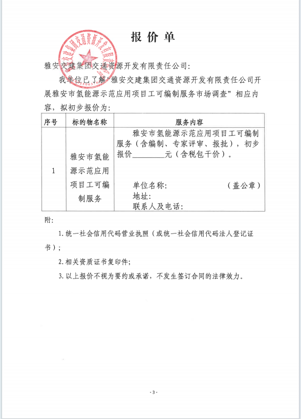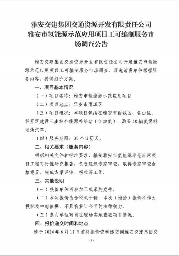 雅安交建集團交通資源開發(fā)有限責任公司雅安市氫能源示范應用項目工可編制服務市場調(diào)查公告
