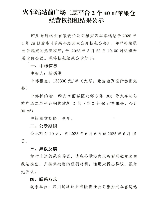 火車站站前廣場二層平臺2個40㎡蘋果倉經(jīng)營權(quán)招租結(jié)果公示