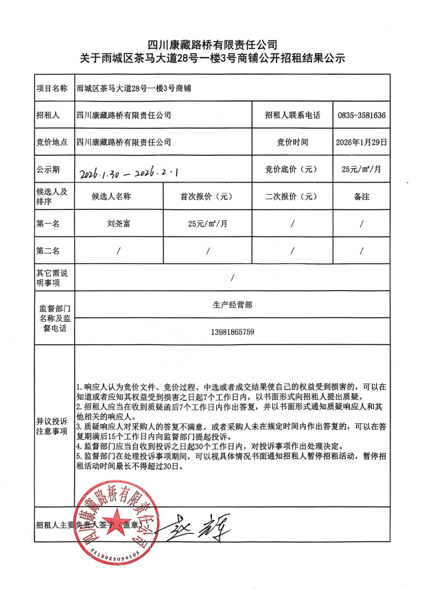 四川康藏路橋有限責任公司關于雨城區(qū)茶馬大道28號一樓3號商鋪公開招租結果公示