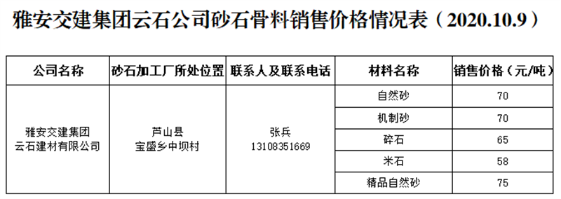 ÑŰ²½»½¨¼¯ˆF(tu¨¢n)ÔÆÊ¯¹«Ë¾É°Ê¯¹ÇÁÏäNÊÛƒr¸ñÇé›r±í£¨2020.10.9£©