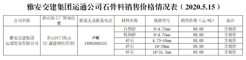 雅安交建集團(tuán)運(yùn)通公司砂石骨料銷售價(jià)格情況表(2020.5.15)