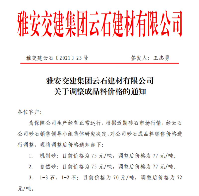 雅安交建集團云石公司砂石骨料銷售價格情況表(2021.5.3)