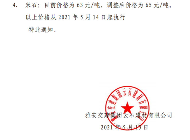 雅安交建集團云石公司砂石骨料銷售價格情況表(2021.5.14)