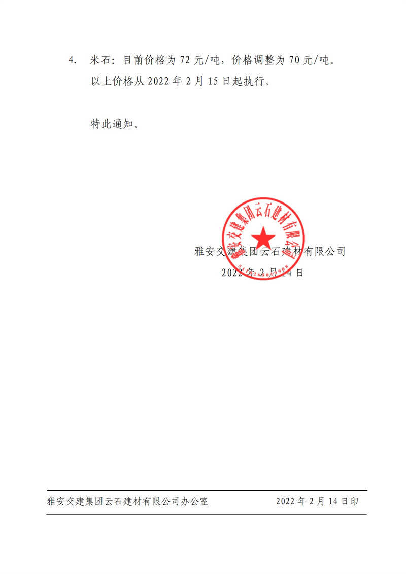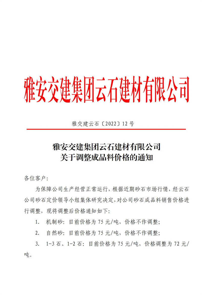 雅安交建集團(tuán)云石建材有限公司關(guān)于調(diào)整成品料價格的通知(2022-2-14)