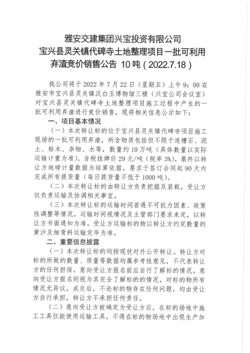 寶興縣靈關(guān)鎮(zhèn)代碑寺土地整理項(xiàng)目一批可利用棄渣競(jìng)價(jià)銷(xiāo)售公告7.18(10萬(wàn)噸)