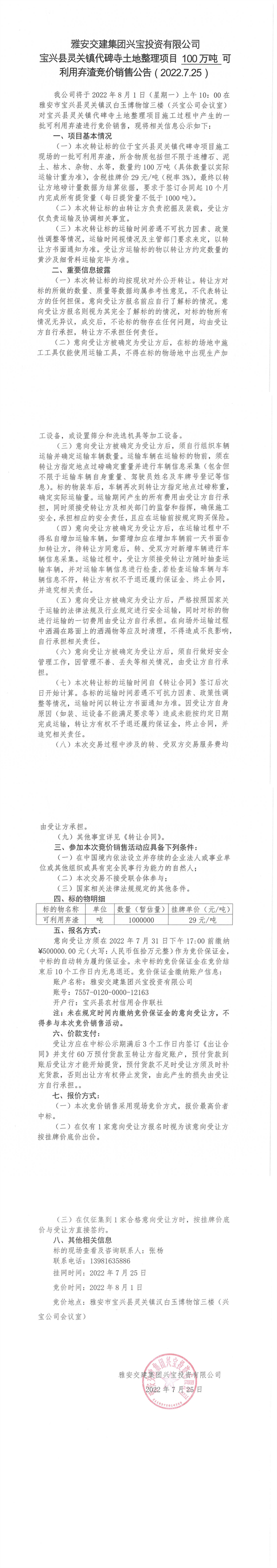 雅安交建集團興寶投資有限公司寶興縣靈關(guān)鎮(zhèn)代碑寺土地整理項目100萬噸可利用棄渣競價銷售公告(2022.7.25)