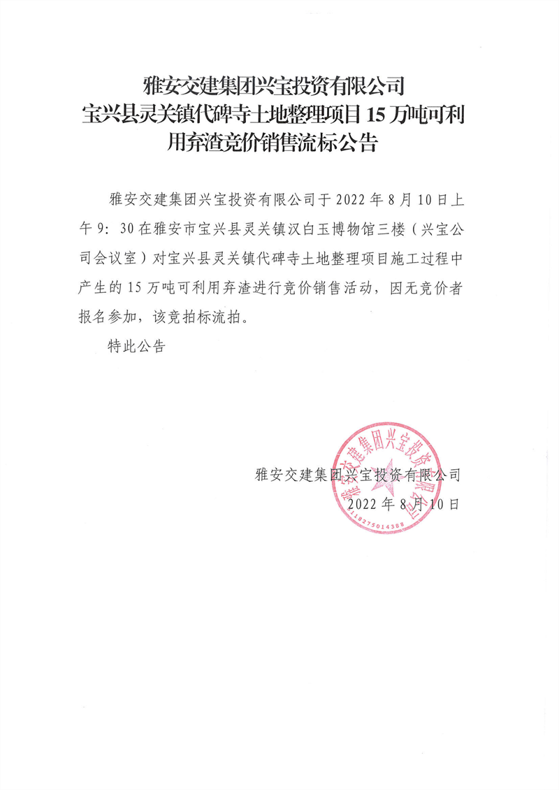 雅安交建集團(tuán)興寶投資有限公司靈關(guān)鎮(zhèn)代碑寺土地整理項(xiàng)目15萬噸可利用棄渣競價(jià)銷售流標(biāo)公告