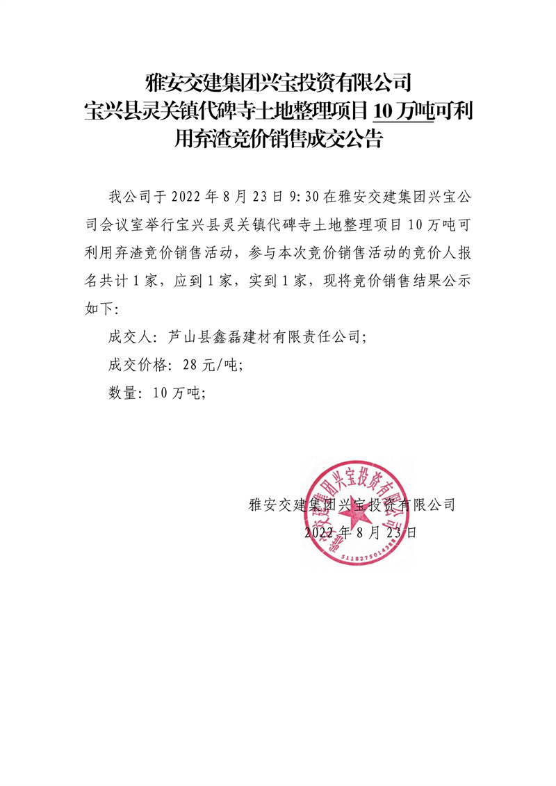 雅安交建集團(tuán)興寶投資有限公司寶興縣靈關(guān)鎮(zhèn)代碑寺土地整理項(xiàng)目10萬噸可利用棄渣競價銷售成交公告(8.23)