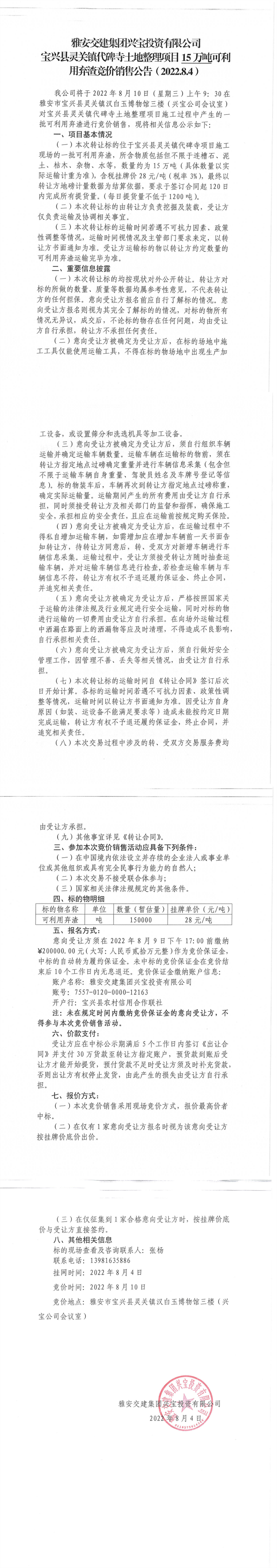 雅安交建集團(tuán)興寶投資有限公司靈關(guān)鎮(zhèn)代碑寺土地整理項(xiàng)目15萬噸可利用棄渣競價(jià)銷售公告(2022.8.4)