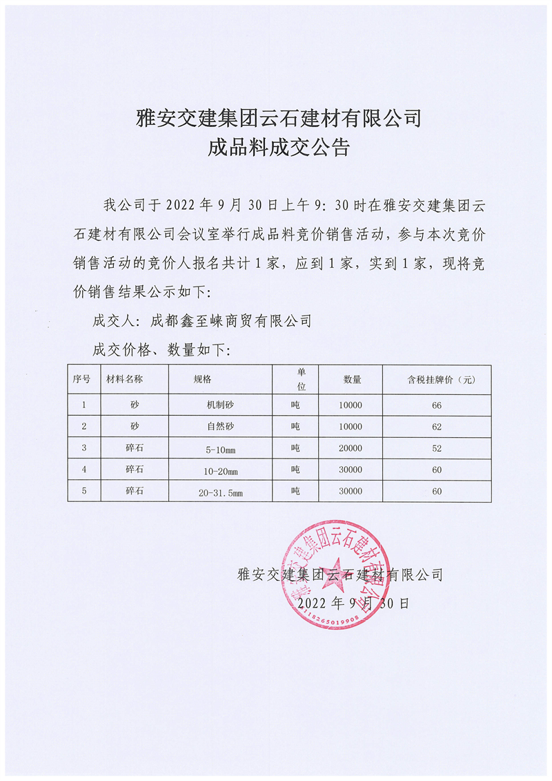 雅安交建集團云石建材有限公司成品料成交公告9.30