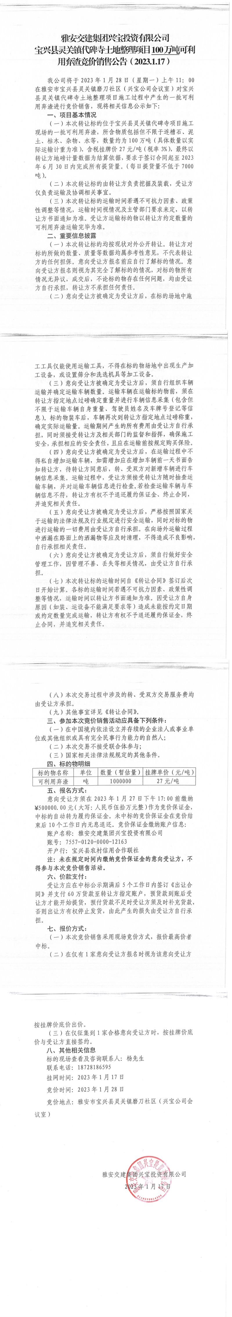 雅安交建集團興寶投資有限公司靈關鎮(zhèn)代碑寺土地整理項目100萬噸可利用棄渣競價銷售公告(2023.1.17)