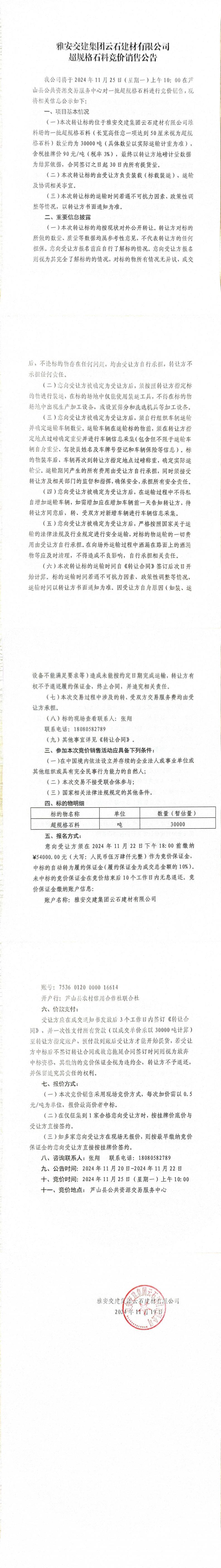 雅安交建集團云石建材有限公司超規(guī)格石料競價銷售公告(2024-11-19)