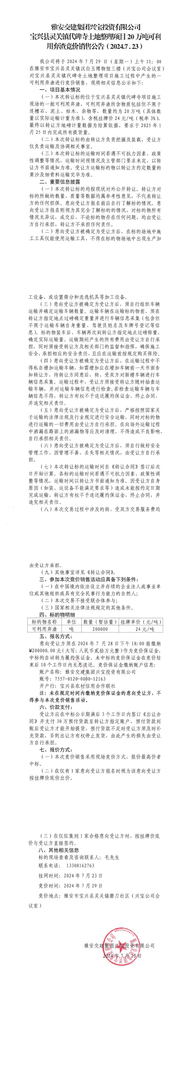 雅安交建集團興寶投資有限公司靈關鎮(zhèn)代碑寺土地整理項目20萬噸可利用棄渣競價銷售公告(2024.7.23)