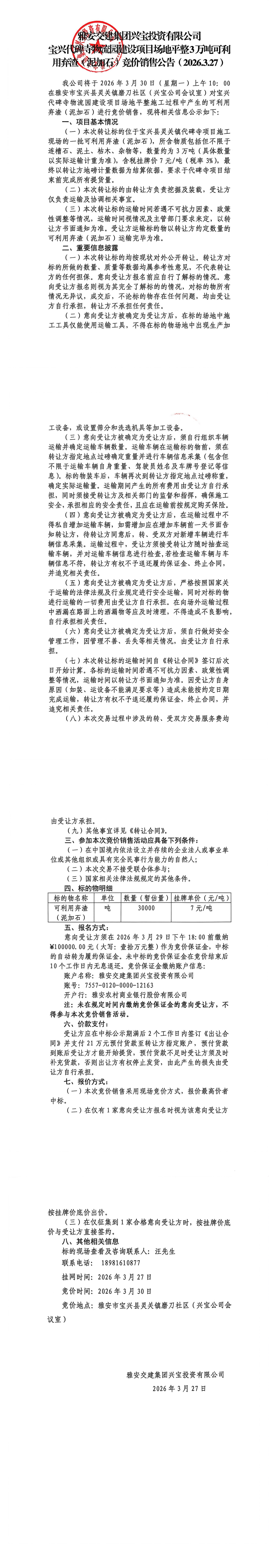 雅安交建集團(tuán)興寶投資有限公司3萬噸泥加石競價(jià)銷售掛網(wǎng)公告(2026.3.27)